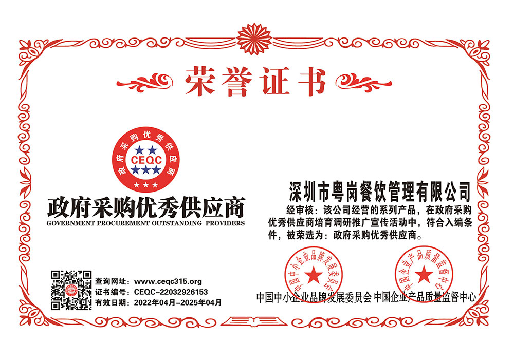 深圳市粵崗餐飲管理有限公司,是一家集蔬菜種植和農(nóng)副產(chǎn)品配送為一體的專業(yè)型餐飲公司,主要為學(xué)校、工廠企事業(yè)機(jī)關(guān)單位提供蔬菜和農(nóng)副產(chǎn)品配送服務(wù)。公司自成立以來始終以質(zhì)優(yōu)價(jià)廉、服務(wù)至上為原則,嚴(yán)格按照ISO:9001國際標(biāo)準(zhǔn)體系進(jìn)行管理。同時(shí)建立了行業(yè)領(lǐng)先的配送中心、大型冷庫和保鮮庫、檢測中心以及專業(yè)化的配送團(tuán)隊(duì),能長期安全、穩(wěn)定、準(zhǔn)時(shí)的配送貨物。我們所有蔬菜均經(jīng)過初步加工、無黃葉,無泥沙等雜質(zhì),利用率達(dá)97%以上...保障向用戶提供的各類食材的衛(wèi)生和質(zhì)量。公司為了適應(yīng)不同客戶的需求,配有專業(yè)人員和配送車輛,實(shí)行“一對一”的服務(wù)體制,一心一意的為客戶服務(wù),秉承粵崗誠實(shí)守信、服務(wù)第一、客戶至上的服務(wù)標(biāo)準(zhǔn),真正讓客戶花最少的錢吃最好的菜。粵崗多年來何以欣欣向榮,因?yàn)槲覀冎乐挥杏掠趽?dān)當(dāng)責(zé)任,才能承擔(dān)更大的責(zé)任,就是因?yàn)?粵崗員工貫徹公司態(tài)度決定一切、細(xì)節(jié)決定成敗的真理,從質(zhì)量抓起,從服務(wù)做起,才創(chuàng)造了如今的規(guī)模化供應(yīng)、統(tǒng)一性配送、專業(yè)化服務(wù)的粵崗。